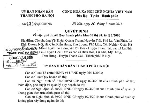 – Phân khu đô thị S4 thuộc chuỗi đô thị phía Đông đường vành đai 4. Thuộc địa giới hành chính các phường Yết Kiêu, Quang Trung, Nguyễn Trãi, Phú La, Vạn Phúc, La Khê, Dương Nội, Hà Cầu, Kiến Hưng, Phú Lương, Phú Lãm, Yên Nghĩa – Quận Hà Đông; xã Đại Mỗ- Huyện Từ Liêm; xã Hữu Hòa – Huyện Thanh Trì; các xã La Phù, Đông La – Huyện Hoài Đức và các xã Bích Hòa, Cự Khê, Mỹ Hưng, Tam Hưng – Huyện Thanh Oai – Thành phố Hà Nội.